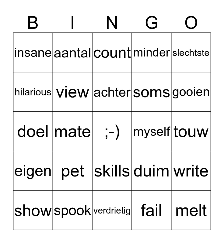 This bingo card has a free space and 34 words: reactie, fail, natuurlijk, scare, eigen, view, slechtste, show, aantal, match, achter, count, scary, lief, myself, gooien, spook, doel, pet, duim, skills, miljard, insane, touw, verdrietig, melt, minder, fall, soms, hilarious, cheers, mate, write and some.