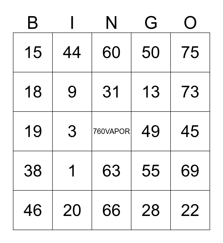 This bingo card has a free space and 24 words: 1, 20, 31, 46, 75, 15, 18, 44, 49, 63, 13, 19, 55, 69, 9, 28, 45, 60, 73, 3, 22, 38, 50 and 66.