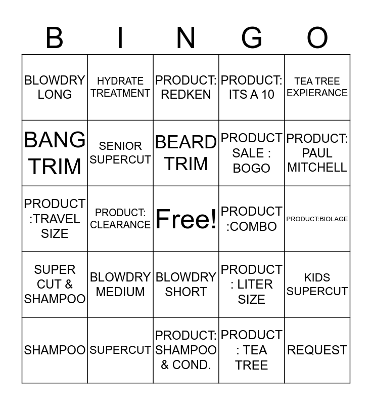 This bingo card has a free space and 24 words: BLOWDRY MEDIUM, SUPERCUT, BEARD TRIM, SHAMPOO, TEA TREE EXPIERANCE, BLOWDRY LONG, BANG TRIM, HYDRATE TREATMENT, PRODUCT :COMBO, BLOWDRY SHORT, PRODUCT SALE : BOGO, PRODUCT :TRAVEL SIZE, PRODUCT : LITER SIZE, KIDS SUPERCUT, SENIOR SUPERCUT, PRODUCT : TEA TREE, PRODUCT:BIOLAGE, PRODUCT: REDKEN, PRODUCT: PAUL MITCHELL, PRODUCT: CLEARANCE, REQUEST, SUPER CUT & SHAMPOO, PRODUCT: ITS A 10 and PRODUCT: SHAMPOO & COND..