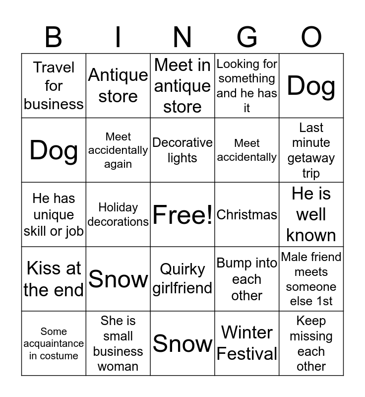 This bingo card has a free space and 24 words: Snow, She is small business woman, Decorative lights, Some acquaintance in costume, Dog, Travel for business, Dog, Antique store, Christmas, Quirky girlfriend, Meet accidentally, He has unique skill or job, Bump into each other, Male friend meets someone else 1st, Meet accidentally again, Winter Festival, He is well known, Meet in antique store, Last minute getaway trip, Holiday decorations, Keep missing each other, Kiss at the end, Looking for something and he has it and Snow.
