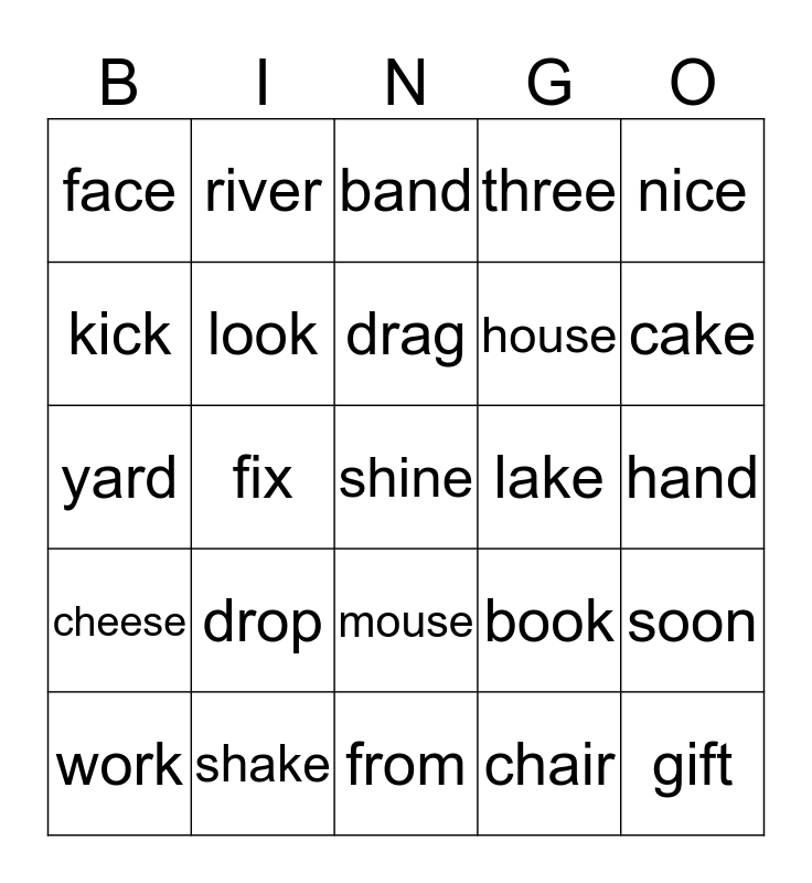This bingo card has 25 words: drop, from, drag, work, nice, face, kick, river, lake, mouse, house, yard, book, soon, look, gift, hand, band, cake, fix, shine, shake, cheese, three and chair.