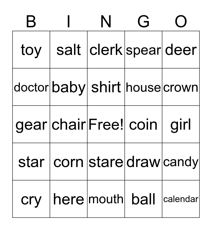 This bingo card has a free space and 29 words: cry, bear, chair, teacher, toy, clerk, baby, corn, coin, here, girl, calendar, mouth, ball, crown, nurse, stare, star, deer, gear, draw, turtle, house, doctor, spear, salt, candy, shirt and color.