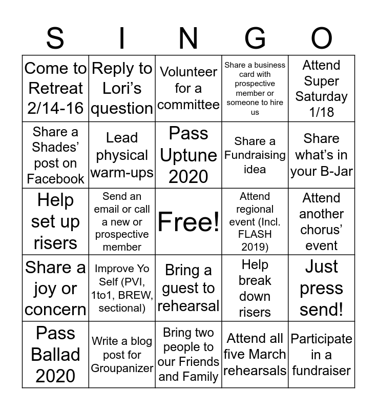 This bingo card has a free space and 24 words: Improve Yo Self (PVI, 1to1, BREW, sectional), Write a blog post for Groupanizer, Pass Uptune 2020, Pass Ballad 2020, Attend Super Saturday 1/18, Come to Retreat 2/14-16, Share a Shades’ post on Facebook, Reply to Lori’s question, Attend regional event (Incl. FLASH 2019), Bring a guest to rehearsal, Share a Fundraising idea, Help set up risers, Help break down risers, Just press send!, Lead physical warm-ups, Attend all five March rehearsals, Attend another chorus’ event, Volunteer for a committee, Share what’s in your B-Jar, Send an email or call a new or prospective member, Participate in a fundraiser, Share a joy or concern, Share a business card with prospective member or someone to hire us and Bring two people to our Friends and Family.
