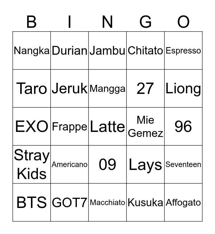 This bingo card has a free space and 24 words: Americano, GOT7, Mangga, BTS, Espresso, Nangka, Taro, Durian, Mie Gemez, 09, 27, EXO, Lays, Seventeen, Jeruk, Kusuka, 96, Jambu, Liong, Frappe, Affogato, Stray Kids, Chitato and Macchiato.