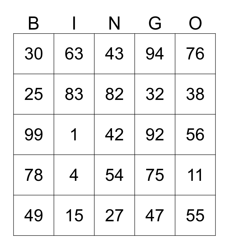This bingo card has a free space and 24 words: 4, 15, 82, 49, 76, 30, 25, 63, 92, 54, 32, 99, 75, 11, 83, 47, 56, 43, 38, 1, 55, 78, 94 and 27.