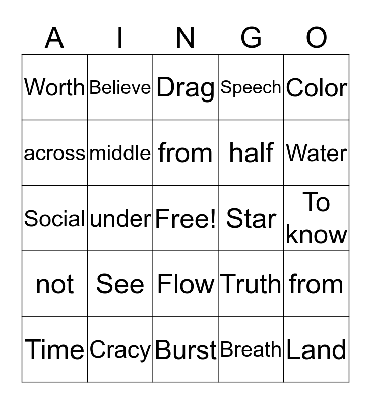 This bingo card has a free space and 44 words: Light, Land, Cover, Time, To write, Breath, Drag, Guide, Color, Cracy, Speech, Star, Flow, See, Carry, Burst, War, Social, Phobos, Water, Believe, Around, Hear, Worth, Melas, To know, Go, All, Truth, not, again, from, in, above, under, before, between, in front, from, across, half, against, middle and too little.