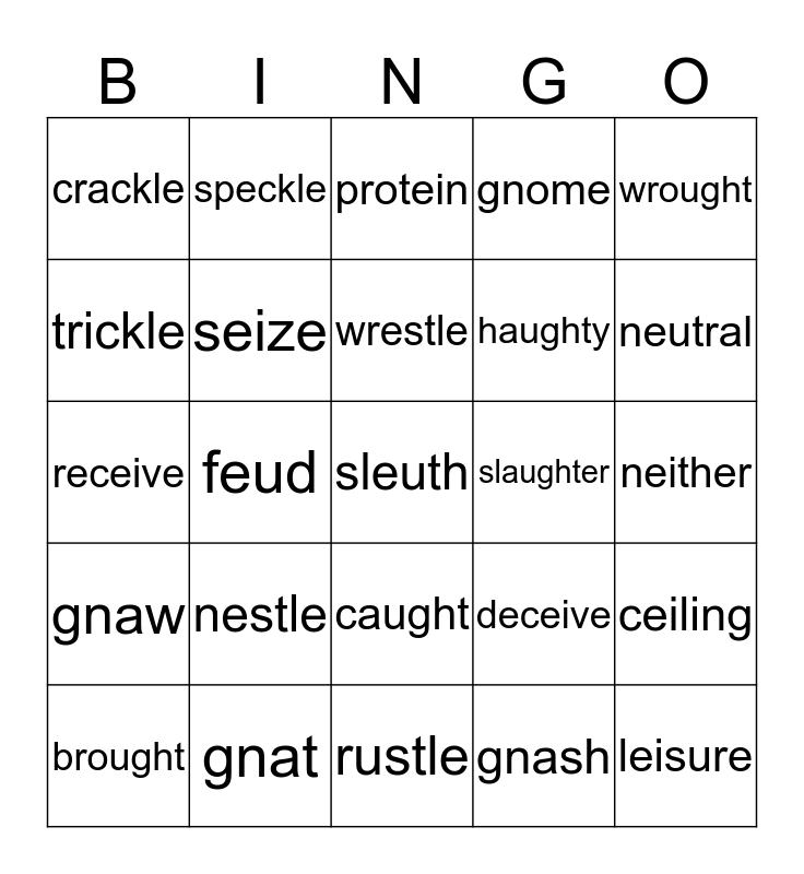 This bingo card has 25 words: nestle, rustle, wrestle, brought, wrought, crackle, trickle, speckle, slaughter, caught, haughty, receive, deceive, ceiling, seize, leisure, neither, protein, neutral, feud, sleuth, gnat, gnaw, gnome and gnash.