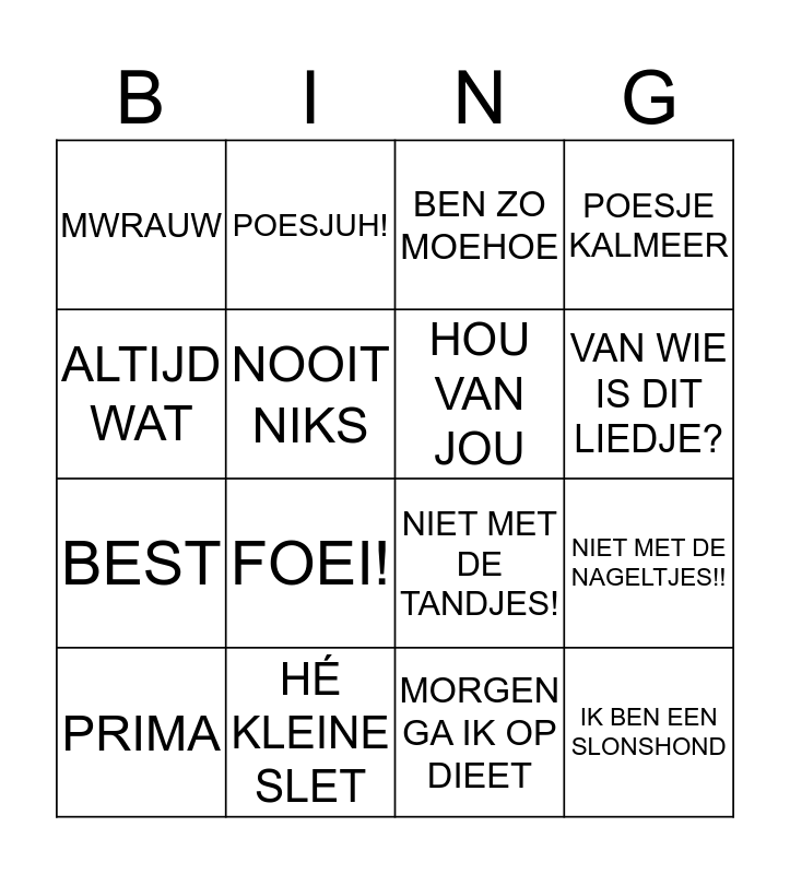 This bingo card has 16 words: HÉ KLEINE SLET, NIET MET DE NAGELTJES!!, BEN ZO MOEHOE, MWRAUW, BEST, POESJUH!, NIET MET DE TANDJES!, MORGEN GA IK OP DIEET, ALTIJD WAT, NOOIT NIKS, PRIMA, POESJE KALMEER, FOEI!, VAN WIE IS DIT LIEDJE?, HOU VAN JOU and IK BEN EEN SLONSHOND.