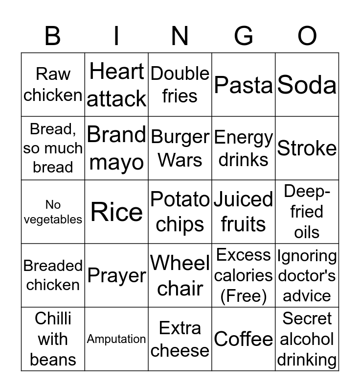 This bingo card has 25 words: Prayer, Extra cheese, Burger Wars, Chilli with beans, Soda, Raw chicken, Bread, so much bread, Heart attack, Juiced fruits, Wheel chair, Energy drinks, No vegetables, Excess calories (Free), Ignoring doctor's advice, Brand mayo, Secret alcohol drinking, Deep-fried oils, Double fries, Stroke, Rice, Potato chips, Amputation, Breaded chicken, Pasta and Coffee.