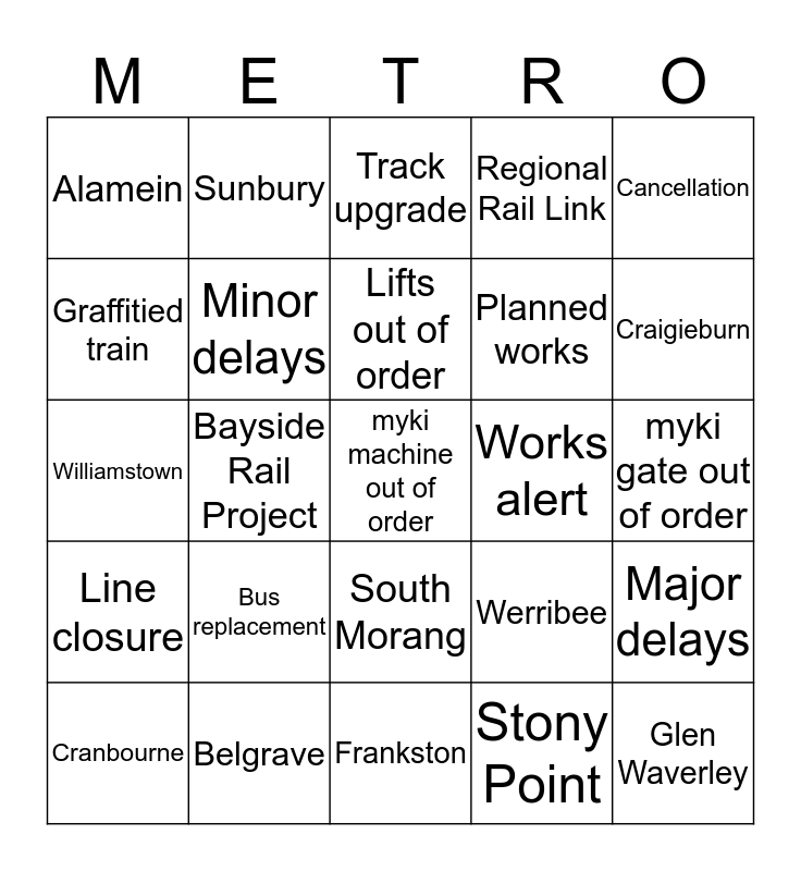This bingo card has 38 words: Driver training, Police incident, Good service, Minor delays, Major delays, Bus replacement, Lifts out of order, Extra services, Cancellation, Planned works, Bayside Rail Project, Regional Rail Link, myki machine out of order, myki gate out of order, Graffitied train, Line closure, Travel alert, Track upgrade, Line suspended, Works alert, Alamein, Belgrave, Craigieburn, Cranbourne, Flemington, Frankston, Glen Waverley, Hurstbridge, Lilydale, Pakenham, Sandringham, South Morang, Stony Point, Sunbury, Upfield, Werribee, Williamstown and V-line.