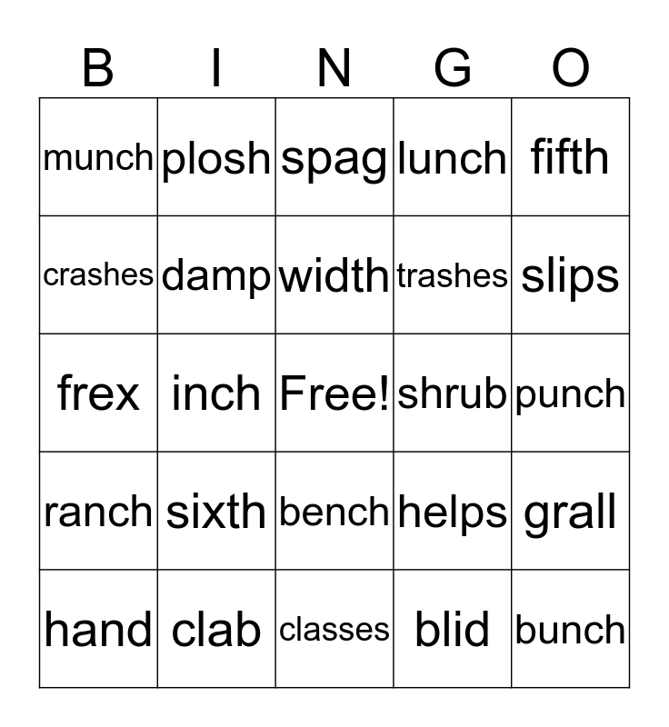 This bingo card has a free space and 39 words: lamp, champ, slam, damp, hand, bench, width, thrill, fifth, ranch, inch, lunch, bunch, punch, shrub, sixth, shred, munch, depth, helps, crashes, classes, trashes, slips, sends, crushes, presses, skills, benches, plosh, droth, flod, spag, clab, blid, quelt, grall, frex and vunt.