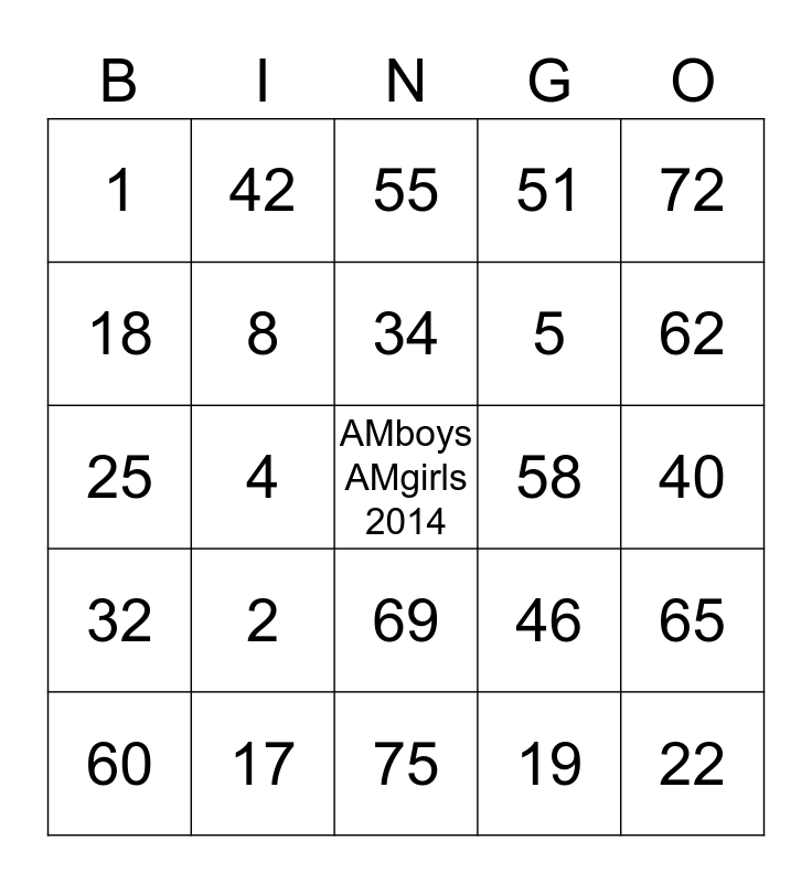 This bingo card has a free space and 24 words: 2, 17, 34, 60, 72, 1, 18, 42, 58, 69, 5, 25, 46, 65, 8, 19, 40, 55, 62, 4, 22, 32, 51 and 75.