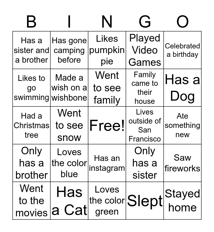 This bingo card has a free space and 24 words: Loves the color blue, Has a Cat, Went to see family, Went to the movies, Celebrated a birthday, Has a sister and a brother, Likes to go swimming, Has gone camping before, Lives outside of San Francisco, Has an instagram, Family came to their house, Had a Christmas tree, Only has a sister, Saw fireworks, Made a wish on a wishbone, Slept, Ate something new, Likes pumpkin pie, Has a Dog, Went to see snow, Stayed home, Only has a brother, Played Video Games and Loves the color green.