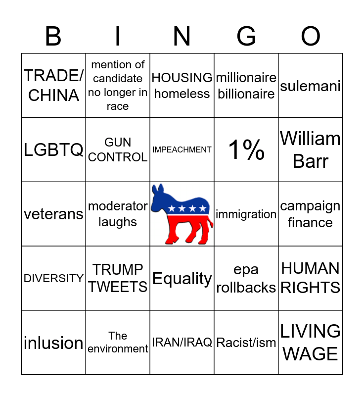 This bingo card has a free space and 25 words: TRUMP TWEETS, IRAN/IRAQ, IMPEACHMENT, inlusion, sulemani, TRADE/ CHINA, LGBTQ, mention of candidate no longer in race, immigration, Equality, 1%, veterans, epa rollbacks, HUMAN RIGHTS, GUN CONTROL, LGTBQ, campaign finance, HOUSING homeless, William Barr, moderator laughs, LIVING WAGE, The environment, DIVERSITY, millionaire billionaire and Racist/ism.