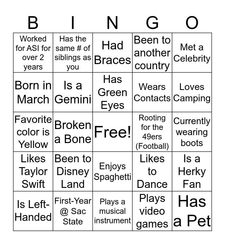 This bingo card has a free space and 24 words: Been to Disney Land, First-Year @ Sac State, Has Green Eyes, Is Left-Handed, Met a Celebrity, Worked for ASI for over 2 years, Born in March, Has the same # of siblings as you, Rooting for the 49ers (Football), Enjoys Spaghetti, Wears Contacts, Favorite color is Yellow, Likes to Dance, Is a Herky Fan, Is a Gemini, Plays video games, Currently wearing boots, Had Braces, Loves Camping, Broken a Bone, Has a Pet, Likes Taylor Swift, Been to another country and Plays a musical instrument.