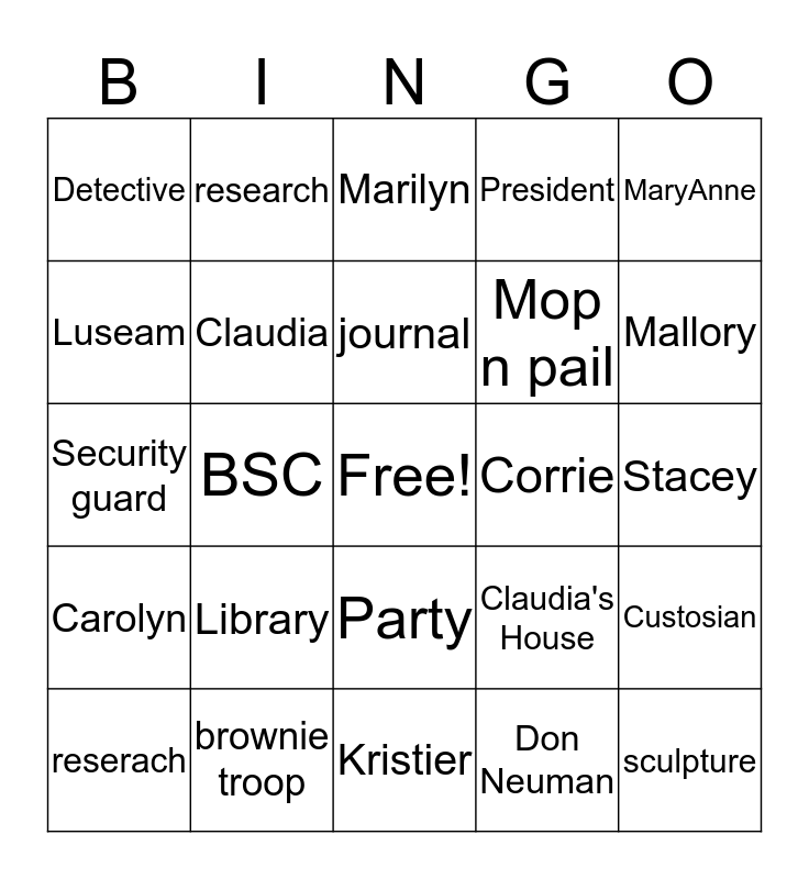 This bingo card has a free space and 24 words: Library, brownie troop, journal, reserach, MaryAnne, Detective, Luseam, research, Corrie, Party, Mop n pail, Security guard, Claudia's House, Custosian, Claudia, Don Neuman, Stacey, Marilyn, Mallory, BSC, sculpture, Carolyn, President and Kristier.