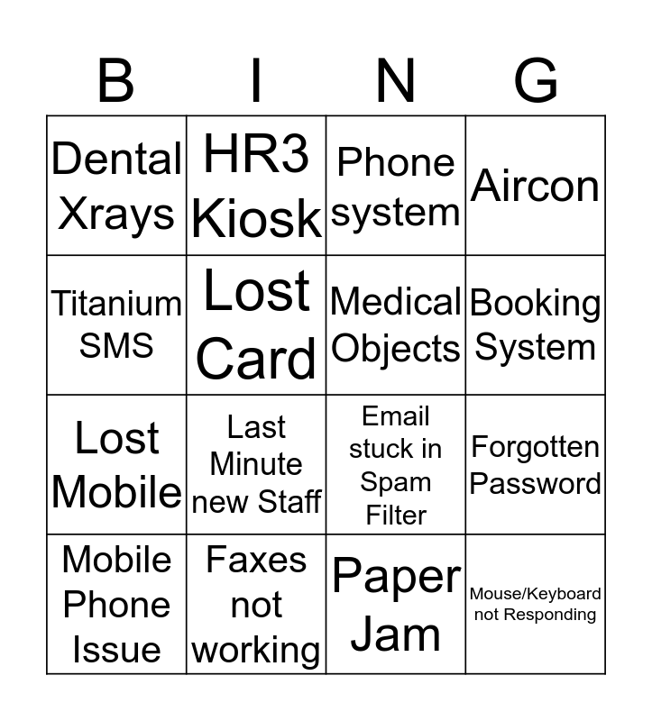 This bingo card has 31 words: Free!, Forgotten Card, Forgotten Password, Last Minute Loan Card, Dental Xrays, Phone system, Medical Objects, BP Running Slow, Faxes not working, Toner Out, Paper Jam, Mobile Phone Issue, File Encryption, Last Minute Telehealth, Last Minute new Staff, PC not Responding, Wifi Password, In-House Music, Mouse/Keyboard not Responding, Check this email, Titanium SMS, BP SMS, iCare Lockout, HR3 Kiosk, Lost Mobile, Lost Card, Aircon, Email stuck in Spam Filter, TopBar, Booking System and Sliding Door.