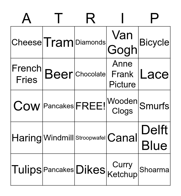 This bingo card has a free space and 24 words: Windmill, Pancakes, Chocolate, Tulips, Bicycle, Cheese, French Fries, Tram, Wooden Clogs, Stroopwafel, Anne Frank Picture, Cow, Canal, Delft Blue, Beer, Curry Ketchup, Smurfs, Diamonds, Lace, Pancakes, Shoarma, Haring, Van Gogh and Dikes.