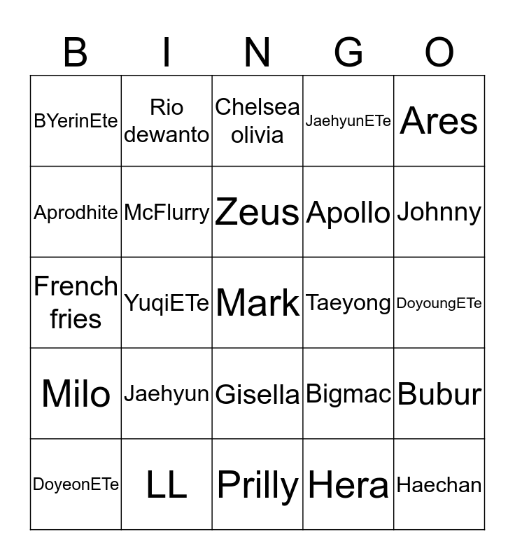This bingo card has a free space and 24 words: Jaehyun, LL, Zeus, DoyeonETe, Ares, BYerinEte, Aprodhite, Rio dewanto, Taeyong, Gisella, Apollo, French fries, Bigmac, Bubur, McFlurry, Hera, DoyoungETe, Chelsea olivia, Johnny, YuqiETe, Haechan, Milo, JaehyunETe and Prilly.