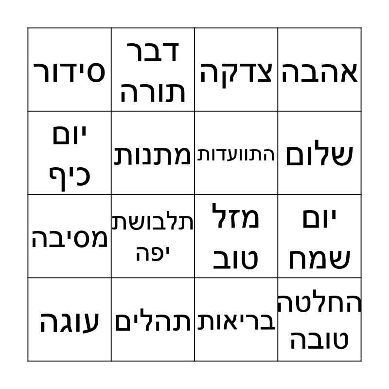This bingo card has 20 words: יום שמח, יום הולדת, צדקה, בלון, עוגה, יום כיף, תהלים, סידור, מסיבה, דבר תורה, תלבושת יפה, מזל טוב, מתנות, החלטה טובה, התוועדות, ברכות, שלום, אהבה, בריאות and יראת שמיים.