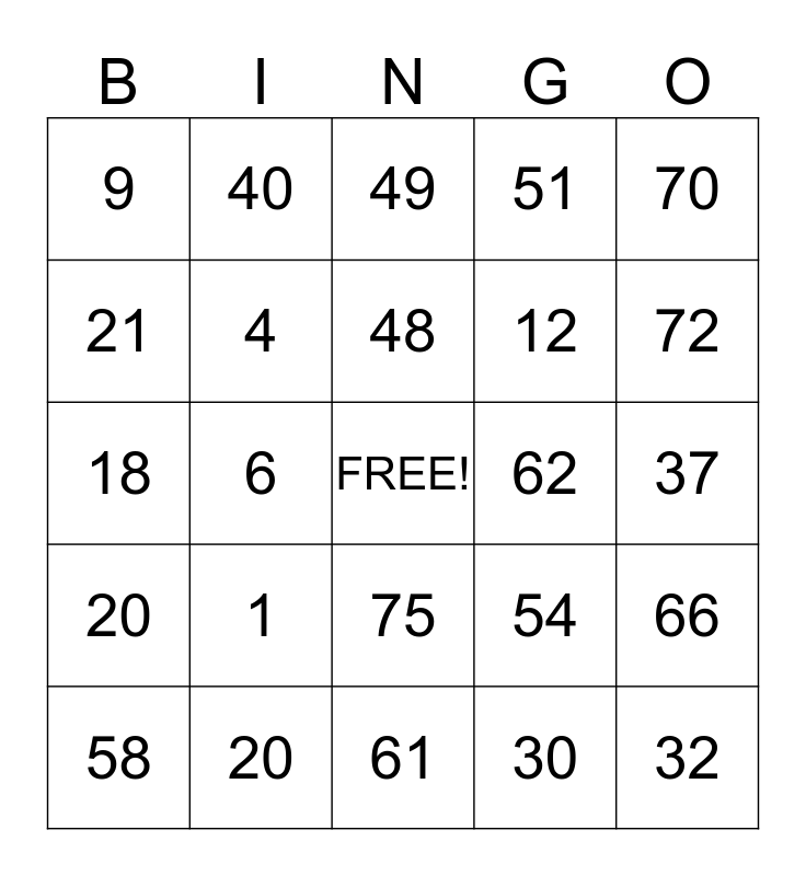 This bingo card has a free space and 24 words: 1, 20, 48, 58, 70, 9, 21, 40, 62, 75, 12, 18, 54, 66, 4, 30, 37, 49, 72, 6, 32, 20, 51 and 61.