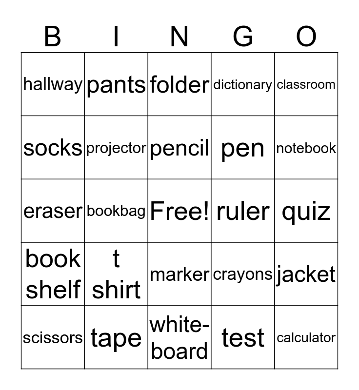 This bingo card has a free space and 24 words: t shirt, tape, pencil, scissors, classroom, hallway, socks, pants, ruler, marker, pen, eraser, crayons, jacket, projector, test, quiz, folder, notebook, bookbag, calculator, book shelf, dictionary and white-board.