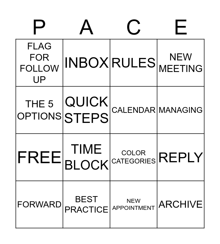 This bingo card has 20 words: REPLY, FOLDERS, RULES, URGENT, FORWARD, THE 5 OPTIONS, BEST PRACTICE, FLAG FOR FOLLOW UP, FREE, INBOX, TIME BLOCK, COLOR CATEGORIES, QUICK STEPS, ARCHIVE, CALENDAR, PENDING, MANAGING, NEW MEETING, NEW APPOINTMENT and PERMISSIONS.
