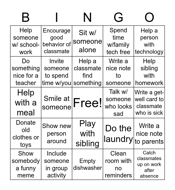 This bingo card has a free space and 29 words: Show somebody a funny meme, Compli-ment some-one's outfit, Smile at someone, Hold the door for someone, Help someone w/ school-work, Sit w/ someone alone, Invite someone to spend time w/you, Show new person around, Talk w/ someone who looks sad, Include someone in group activity, Write a get-well card to classmate who is sick, Catch classmates up on work after absence, Empty dishwasher, Clean room with no reminders, Help sibling with homework, Take out the trash, Play with sibling, Donate old clothes or toys, Help a person with technology, Help with a meal, Do the laundry, Help with yard work, Write a nice note to someone, Do something nice for a teacher, Spend time w/family tech free, Encourage good behavior of classmate, Write a nice note to parents, Help a classmate find something and Visit someone you haven't seen in awhile.