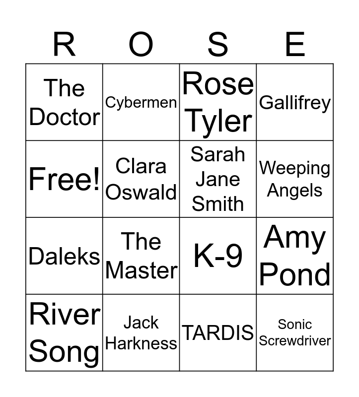 This bingo card has 16 words: Jack Harkness, Amy Pond, Rose Tyler, The Doctor, Daleks, Cybermen, K-9, TARDIS, Free!, Clara Oswald, River Song, Gallifrey, The Master, Weeping Angels, Sarah Jane Smith and Sonic Screwdriver.