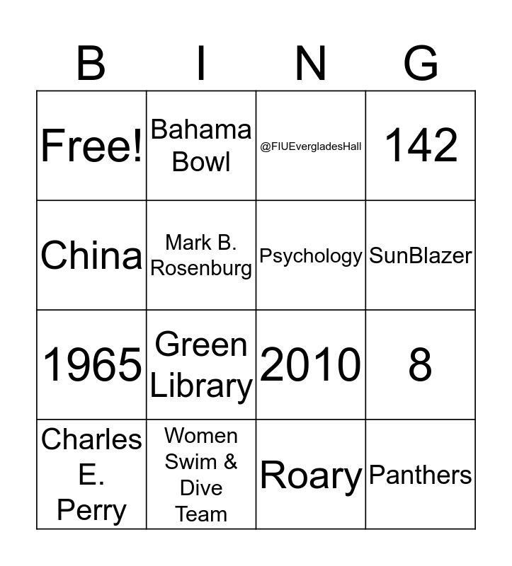 This bingo card has 18 words: China, Women Swim & Dive Team, @FIUEvergladesHall, 142, 1965, Bahama Bowl, 2010, SunBlazer, Free!, Green Library, Roary, 8, Charles E. Perry, Mark B. Rosenburg, Psychology, Panthers, Uproar and UM.
