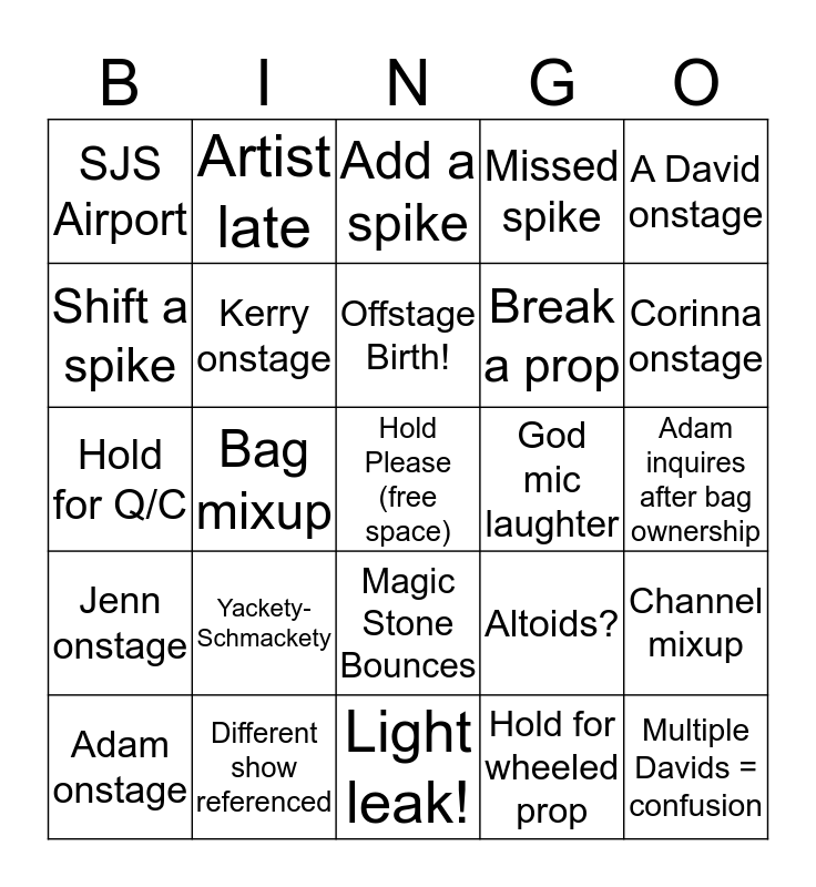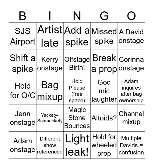 This bingo card has a free space and 27 words: Altoids?, 3 crew looking up onstage w/ flashlights, Break a prop, Light leak!, Shift a spike, Add a spike, Artist late, Jenn onstage, God mic laughter, Channel mixup, Hold for Q/C, Missed spike, Adam onstage, Different show referenced, Corinna onstage, Karen onstage, Kerry onstage, Offstage Birth!, Yackety-Schmackety, SJS Airport, Adam inquires after bag ownership, Hold for wheeled prop, Bag mixup, Multiple Davids = confusion, Magic Stone Bounces, A David onstage and Two Davids onstage.