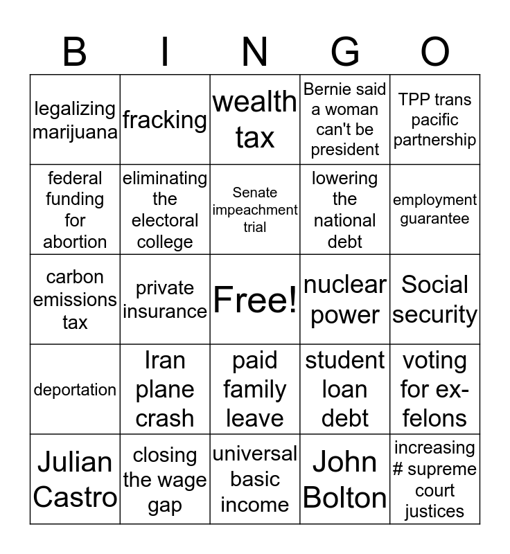 This bingo card has a free space and 24 words: Julian Castro, Iran plane crash, Senate impeachment trial, John Bolton, TPP trans pacific partnership, legalizing marijuana, fracking, wealth tax, nuclear power, Social security, carbon emissions tax, eliminating the electoral college, student loan debt, voting for ex-felons, federal funding for abortion, closing the wage gap, universal basic income, Bernie said a woman can't be president, employment guarantee, deportation, private insurance, paid family leave, lowering the national debt and increasing # supreme court justices.
