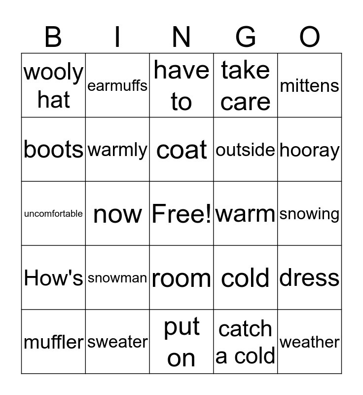 This bingo card has a free space and 24 words: snowman, sweater, coat, muffler, mittens, wooly hat, boots, earmuffs, warm, room, outside, uncomfortable, cold, dress, warmly, catch a cold, snowing, have to, hooray, now, weather, How's, take care and put on.