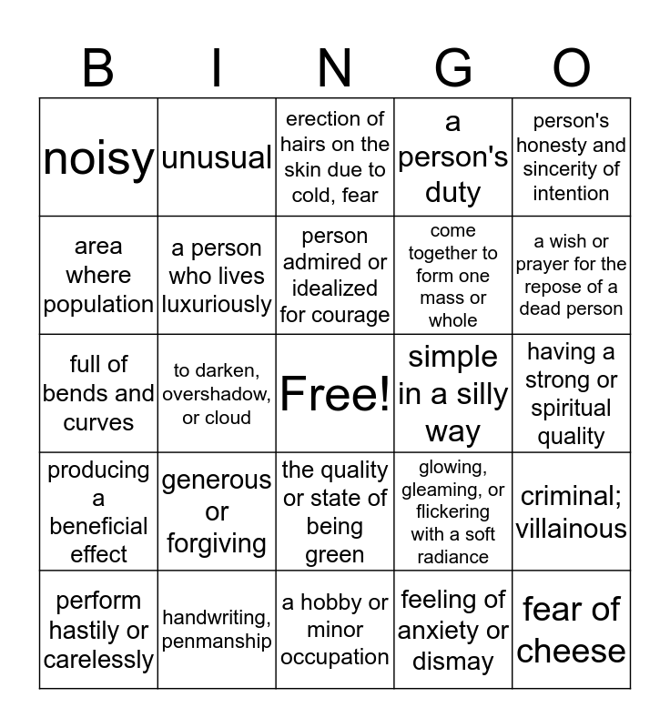 This bingo card has a free space and 24 words: generous or forgiving, handwriting, penmanship, person admired or idealized for courage, perform hastily or carelessly, person's honesty and sincerity of intention, noisy, area where population, unusual, simple in a silly way, the quality or state of being green, come together to form one mass or whole, full of bends and curves, glowing, gleaming, or flickering with a soft radiance, criminal; villainous, a person who lives luxuriously, feeling of anxiety or dismay, having a strong or spiritual quality, erection of hairs on the skin due to cold, fear, a wish or prayer for the repose of a dead person, to darken, overshadow, or cloud, fear of cheese, producing a beneficial effect, a person's duty and a hobby or minor occupation.