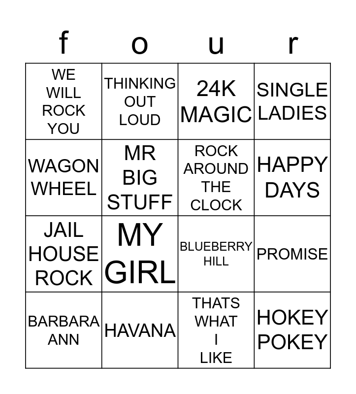 This bingo card has 18 words: MY GIRL, HOKEY POKEY, 24K MAGIC, WE WILL ROCK YOU, BLUEBERRY HILL, SINGLE LADIES, BARBARA ANN, THINKING OUT LOUD, HAPPY DAYS, JAIL HOUSE ROCK, THATS WHAT I LIKE, WAGON WHEEL, PROMISE, MR BIG STUFF, ROCK AROUND THE CLOCK, AS LONG AS YOU LOVE ME, HAVANA and ALL OF ME.