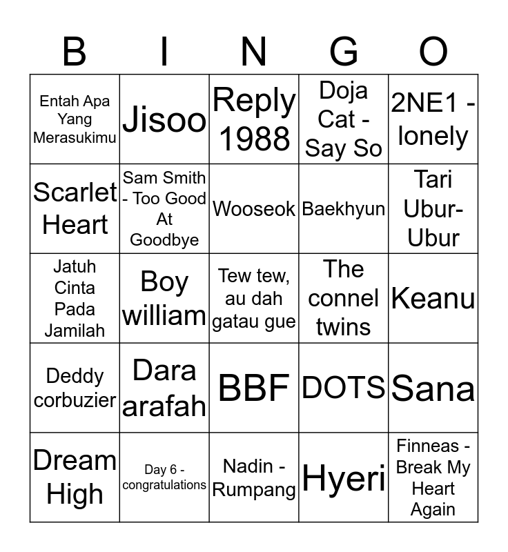This bingo card has a free space and 24 words: Dara arafah, Day 6 - congratulations, Wooseok, Dream High, 2NE1 - lonely, Entah Apa Yang Merasukimu, Scarlet Heart, Jisoo, The connel twins, BBF, Baekhyun, Jatuh Cinta Pada Jamilah, DOTS, Sana, Sam Smith - Too Good At Goodbye, Hyeri, Keanu, Reply 1988, Tari Ubur-Ubur, Boy william, Finneas - Break My Heart Again, Deddy corbuzier, Doja Cat - Say So and Nadin - Rumpang.