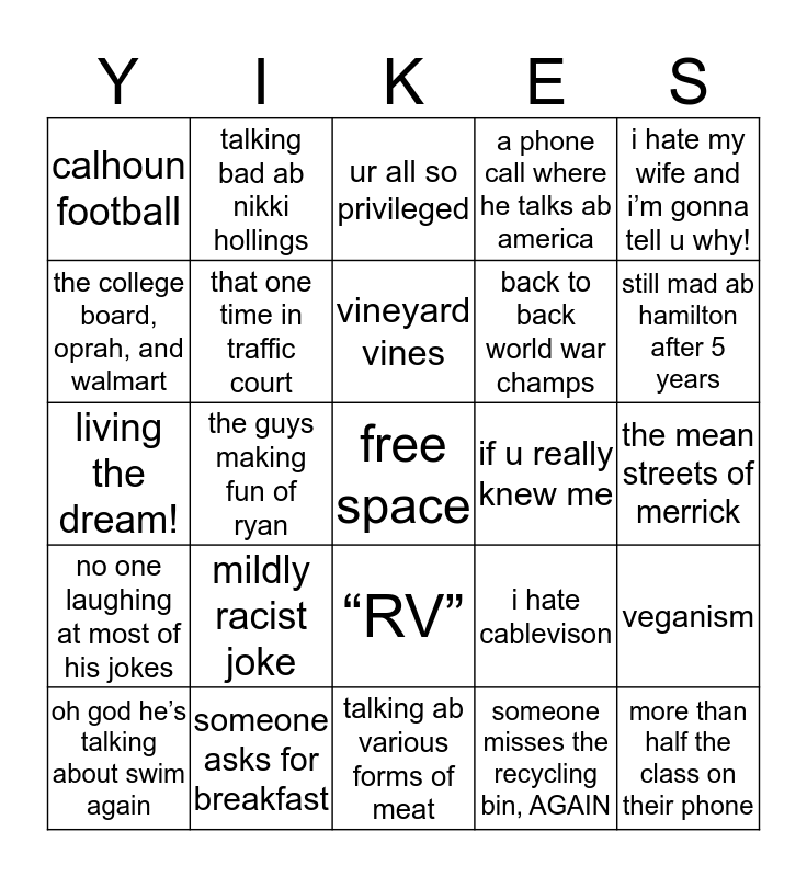 This bingo card has a free space and 24 words: mildly racist joke, someone asks for breakfast, vineyard vines, oh god he’s talking about swim again, i hate my wife and i’m gonna tell u why!, calhoun football, the college board, oprah, and walmart, talking bad ab nikki hollings, if u really knew me, “RV”, back to back world war champs, living the dream!, i hate cablevison, veganism, that one time in traffic court, someone misses the recycling bin, AGAIN, the mean streets of merrick, ur all so privileged, still mad ab hamilton after 5 years, the guys making fun of ryan, more than half the class on their phone, no one laughing at most of his jokes, a phone call where he talks ab america and talking ab various forms of meat.