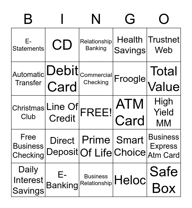 This bingo card has a free space and 24 words: Direct Deposit, E- Banking, Commercial Checking, Daily Interest Savings, Trustnet Web, E- Statements, Automatic Transfer, CD, ATM Card, Prime Of Life, Froogle, Christmas Club, Smart Choice, Business Express Atm Card, Debit Card, Heloc, High Yield MM, Relationship Banking, Total Value, Line Of Credit, Safe Box, Free Business Checking, Health Savings and Business Relationship.