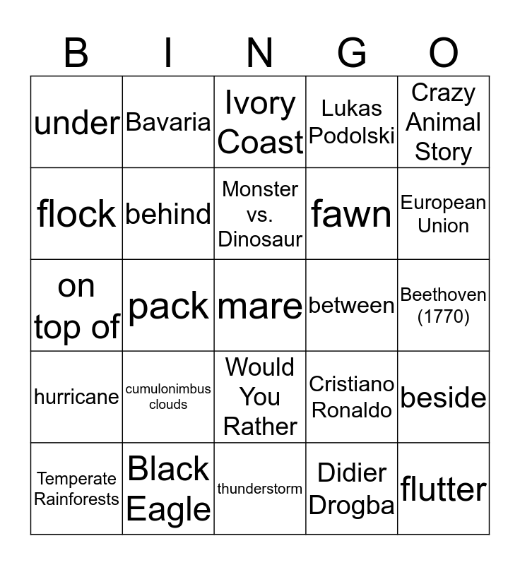 This bingo card has 25 words: cumulonimbus clouds, thunderstorm, Monster vs. Dinosaur, Temperate Rainforests, Crazy Animal Story, under, flock, Bavaria, between, Would You Rather, fawn, on top of, Cristiano Ronaldo, beside, behind, flutter, Beethoven (1770), Ivory Coast, European Union, pack, mare, Black Eagle, hurricane, Lukas Podolski and Didier Drogba.