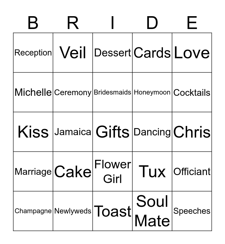 This bingo card has 38 words: Bride, Groom, Wedding, Ceremony, Officiant, Cake, Bridesmaids, Groomsmen, Love, Honeymoon, Jamaica, Cards, Gifts, Chris, Michelle, Marriage, Ice Cream, Dessert, Italian, Dancing, Reception, Newlyweds, Cocktails, Champagne, Everlasting, Toast, Speeches, DJ, Vows, Celebration, Ring, Flower Girl, Soul Mate, Veil, Dress, Tux, Kiss and March.