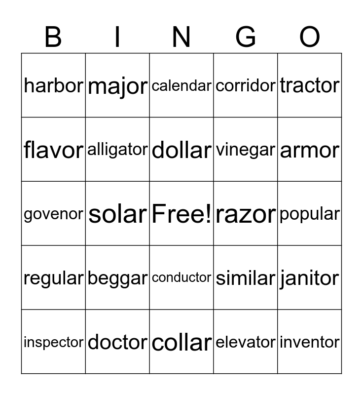 This bingo card has a free space and 24 words: beggar, doctor, dollar, inspector, tractor, harbor, flavor, major, razor, conductor, vinegar, govenor, similar, janitor, alligator, elevator, popular, calendar, armor, solar, inventor, regular, corridor and collar.