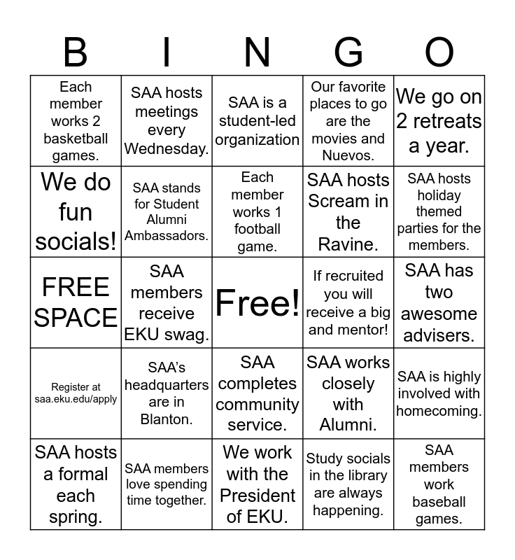 This bingo card has a free space and 25 words: SAA’s headquarters are in Blanton., We work with the President of EKU., Each member works 1 football game., SAA hosts a formal each spring., We go on 2 retreats a year., Each member works 2 basketball games., We do fun socials!, SAA hosts meetings every Wednesday., If recruited you will receive a big and mentor!, SAA completes community service., SAA hosts Scream in the Ravine., FREE SPACE, SAA works closely with Alumni., SAA is highly involved with homecoming., SAA stands for Student Alumni Ambassadors., EKU SAA was started in 1985., SAA has two awesome advisers., SAA is a student-led organization, SAA hosts holiday themed parties for the members., SAA members receive EKU swag., SAA members work baseball games., SAA members love spending time together., Register at saa.eku.edu/apply, Our favorite places to go are the movies and Nuevos. and Study socials in the library are always happening..