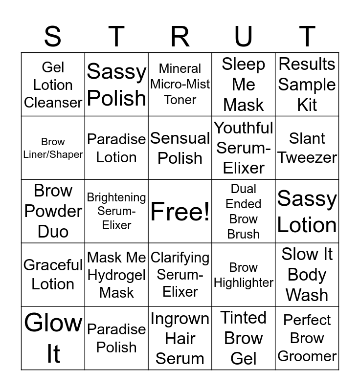 This bingo card has a free space and 29 words: Glow It, Ingrown Hair Wipes, Brightening Serum-Elixer, Slow It Body Lotion, Gel Lotion Cleanser, Mineral Micro-Mist Toner, Paradise Lotion, Mask Me Hydrogel Mask, Dual Ended Brow Brush, Paradise Polish, Sassy Lotion, Perfect Brow Groomer, Ingrown Hair Serum, Tinted Brow Gel, Slant Tweezer, Graceful Polish, Clarifying Serum-Elixer, Graceful Lotion, Results Sample Kit, Brow Powder Duo, Brow Highlighter, Body Exfoliating Gel, Youthful Serum-Elixer, Brow Liner/Shaper, Sleep Me Mask, Sassy Polish, Slow It Body Wash, Sensual Polish and Face Exfoliate Gel.