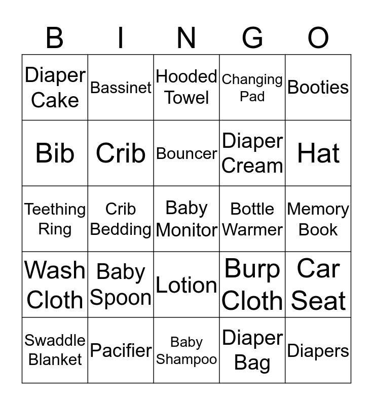 This bingo card has 50 words: Baby Carrier, Baby Monitor, Baby Powder, Baby Shampoo, Baby Spoon, Baby Swing, Bassinet, Bathtub, Bib, Blanket, Crib, Changing Pad, Car Seat, Burp Cloth, Bulb Syringe, Breast Pump, Bouncer, Bottle Warmer, Bottle, Booties, Crib Bedding, Diaper Bag, Diaper Cake, Diaper Cream, Diaper Pail, Diapers, Hat, High Chair, Hooded Towel, Lotion, Rattle, Playpen, Picture Frame, Parenting Book, Pacifier, Onesie, Nursing Pillow, Nail Clippers, Mobile, Memory Book, Shoes, Socks, Stroller, Stuffed Animal, Swaddle Blanket, Teething Ring, Thermometer, Travel Toys, Wash Cloth and Wipes.