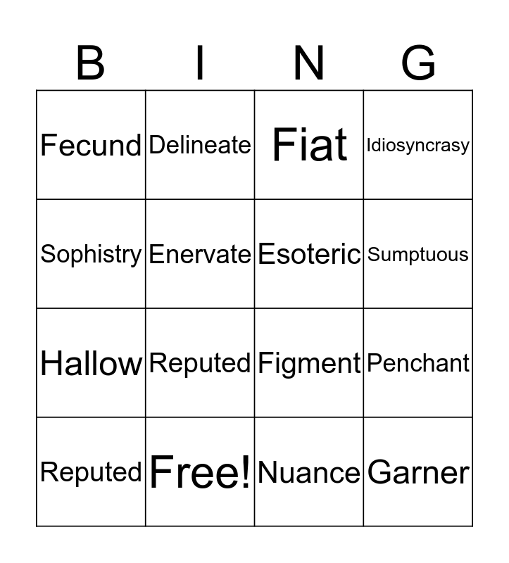 This bingo card has 22 words: Free!, Acuity, Delineate, Depraved, Enervate, Esoteric, Fecund, Fiat, Figment, Garner, Hallow, Idiosyncrasy, Ignominy, Mundane, Nuance, Overweening, Penchant, Reputed, Reputed, Sophistry, Sumptuous and Ubiquitous.