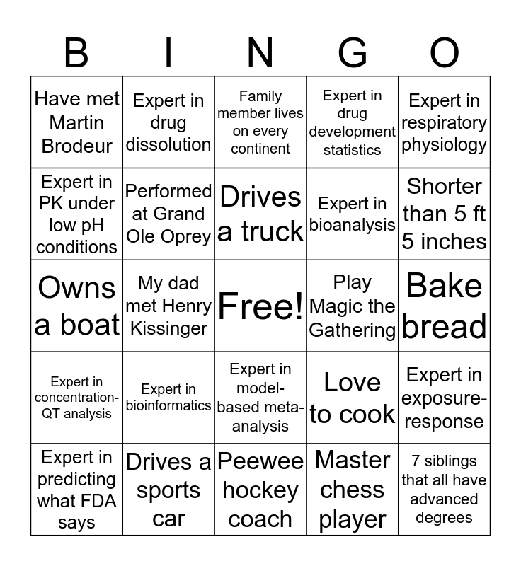 This bingo card has a free space and 31 words: Peewee hockey coach, 3 pharmacists in family, My dad met Henry Kissinger, Play clarinet, Have met Martin Brodeur, Family member lives on every continent, Performed at Grand Ole Oprey, Love to cook, Play Magic the Gathering, Master chess player, Bake bread, 7 siblings that all have advanced degrees, Blue eyes, Facial hair, Shorter than 5 ft 5 inches, Expert in D-optimal design, Expert in exposure-response, Expert in bioinformatics, Expert in concentration-QT analysis, Expert in model-based meta-analysis, Expert in respiratory physiology, Expert in fetal lung maturation, Expert in predicting what FDA says, Expert in drug dissolution, Expert in bioanalysis, Expert in PK under low pH conditions, Expert in drug development statistics, Owns a boat, Drives a sports car, Drives a truck and Takes public transportation to work.