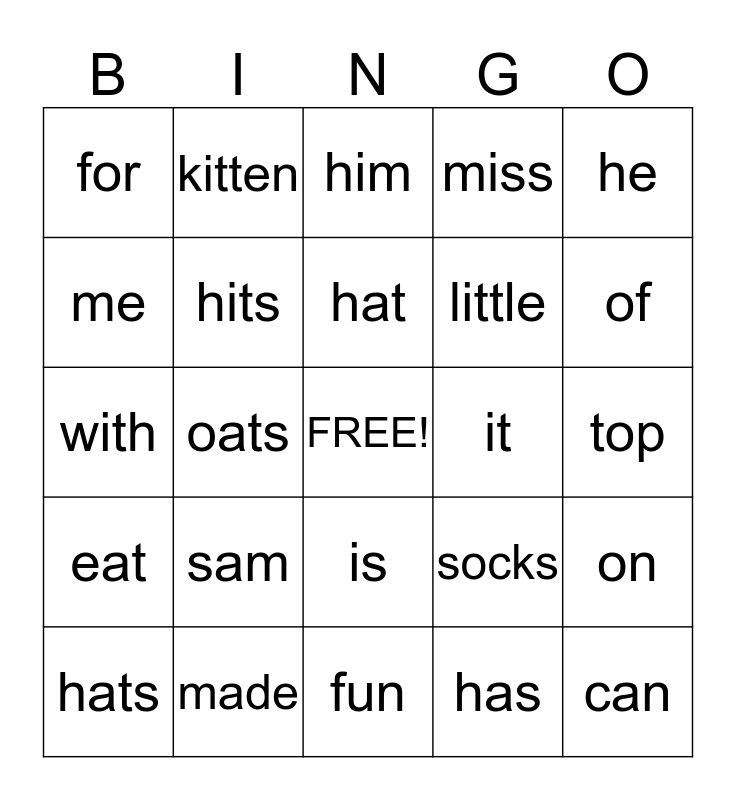 This bingo card has a free space and 24 words: sam, made, hat, hats, he, for, me, kitten, it, is, little, with, socks, on, hits, has, top, him, of, oats, can, eat, miss and fun.