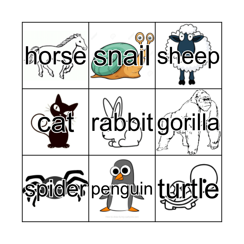 This bingo card has 15 images and 15 words: hippo, giraffe, sheep, horse, penguin, rabbit, hamster, snake, gorilla, turtle, dog, cat, spider, snail and bird.