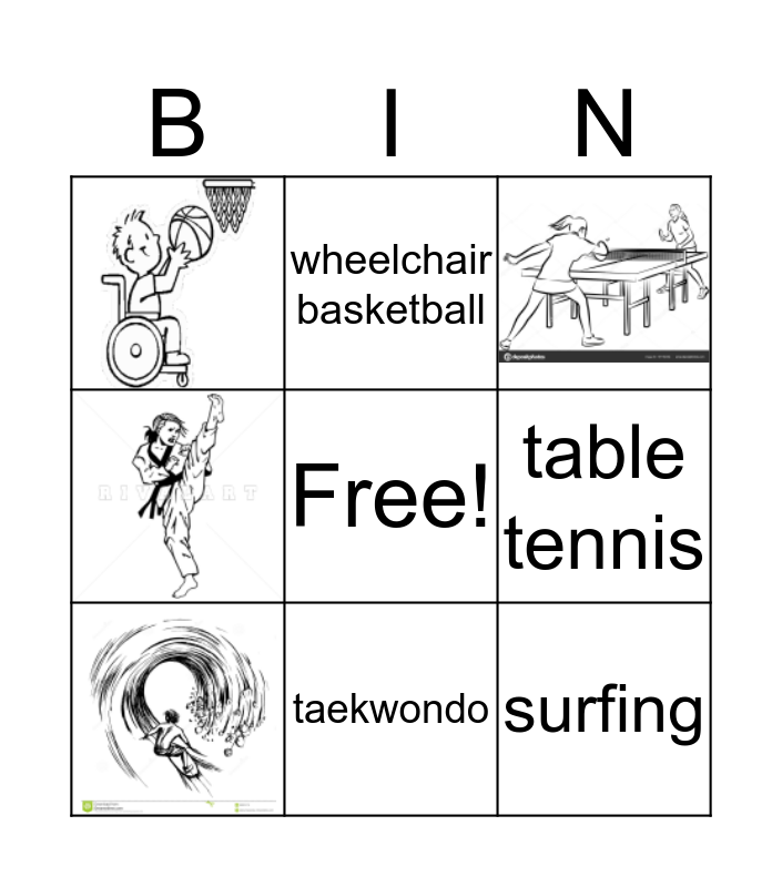 This bingo card has 4 images, a free space and 4 words: table tennis, wheelchair basketball, surfing and taekwondo.