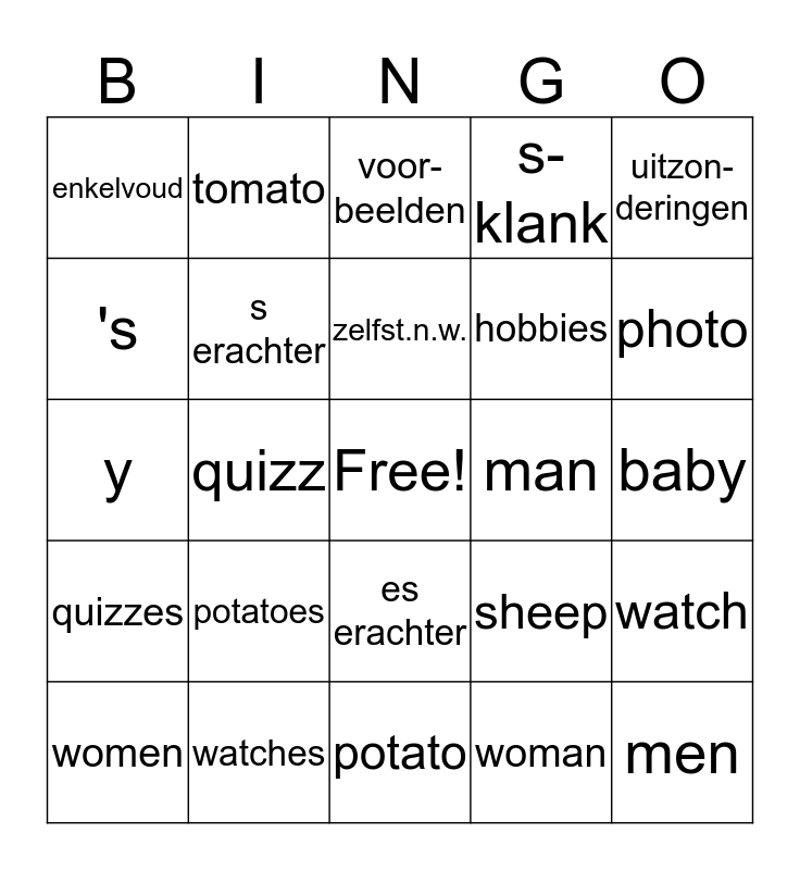 This bingo card has a free space and 35 words: meervoud, plural, standaard regel, s erachter, es erachter, s-klank, 's, nooit, zelfst.n.w., ies, y, uitzon-deringen, mede-klinker, klinker, enkelvoud, man, woman, quizz, quizzes, men, sheep, women, watch, watches, voor-beelden, photo, photos, hobby, hobbies, baby, babies, potato, potatoes, tomato and tomatoes.